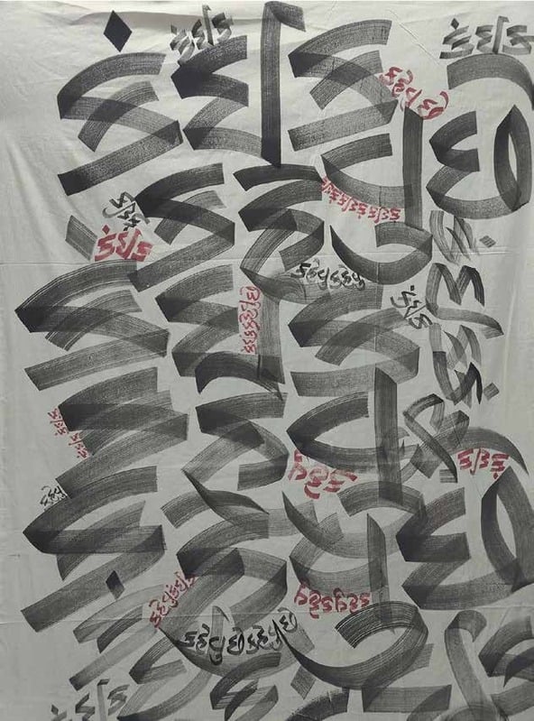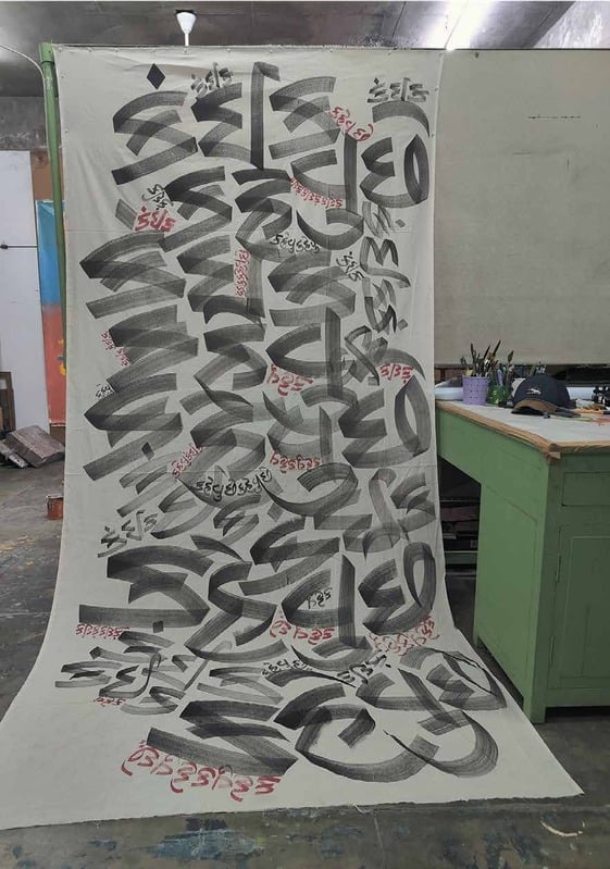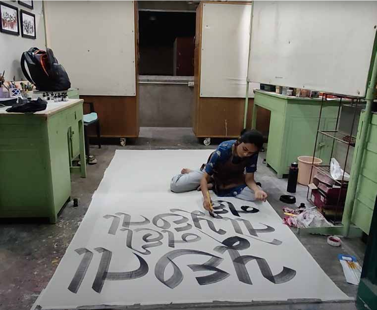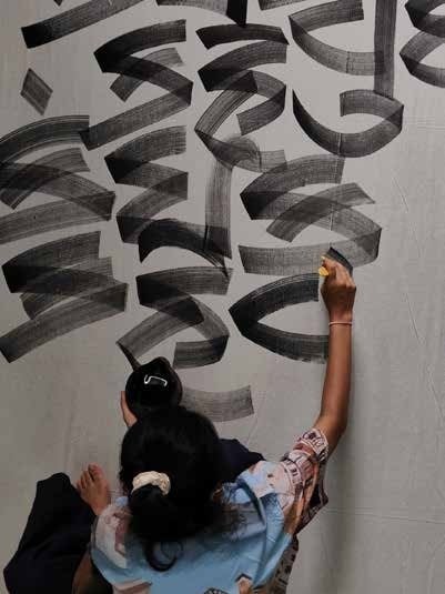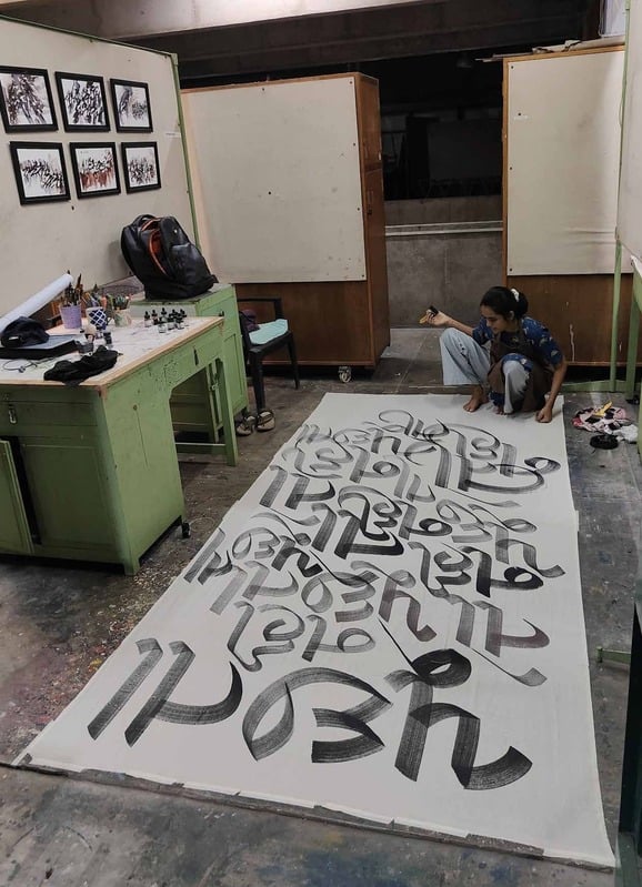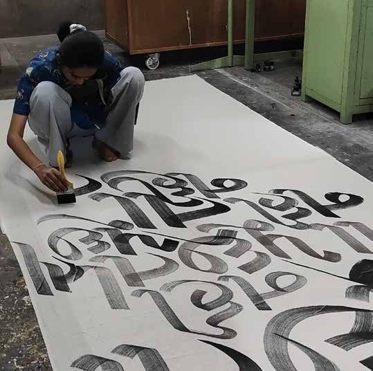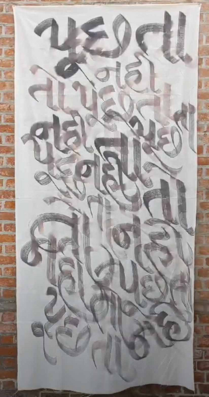 This project explores the expressive power of Gujarati letterforms through large-scale calligraphy installations and wearable art. Writing letters on expansive surfaces transformed the experience—amplifying their presence and allowing a deeper appreciation of their form. The process felt like an act of opening, with a meditative quality both for the creator and the viewer.