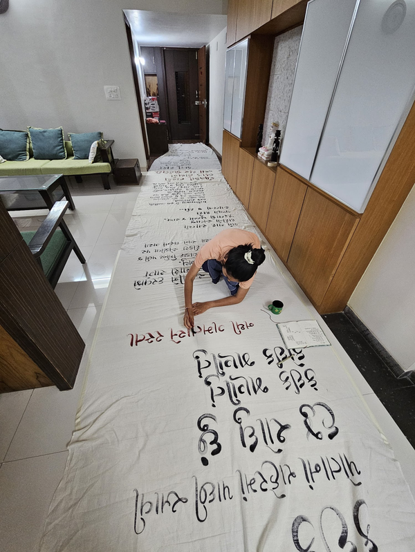 Paachi Vadi means returning to my hometown, Amdavad, to rediscover its streets, people, and everyday life. This work reflects my journey attempt to explore the city, finding new places, spaces, and conversations that ultimately gravitate me to connect/reconnect with the familiar. This tapestry serves as a large-scale magnified abstract from my journal. It encapsulates my thoughts and emotions about the city’s heritage, streets, homes, and conversations. Writing in my mother tongue, Gujarati reinforces my deep-rooted connection to this place. I chose handwoven Khadi cloth to represent Amdavad’s strong connection to this fabric, symbolizing simplicity and tradition. Using natural dyes and sustainable materials helps reconnect with this heritage. The process of creating this work is both personal and meditative, the city’s traditions while making the act of creation as meaningful as the artwork itself.